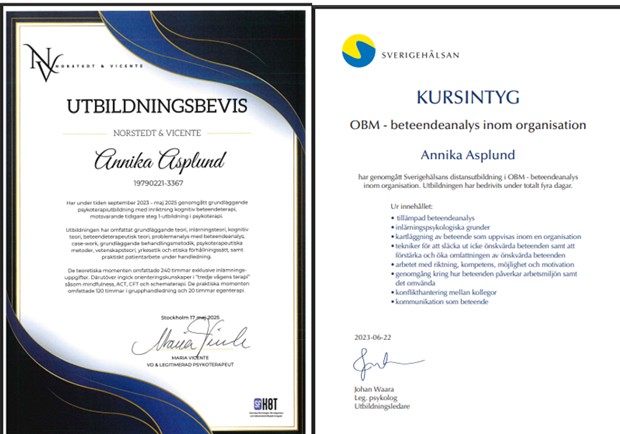 Min nyfikenhet kring psykisk ohälsa ledde mig till en psykoterapiutbildning med fokus på terapiformen kognitiv beteendeterapi (KBT), med inslag av andra terapiformer som idag integrerats med KBT: acceptance and comittment therapy (ACT; acceptans ), compassion focused therapy (CFT; självmedkänsla), schematerapi (livsmönster) och mindfullness (medveten närvaro).